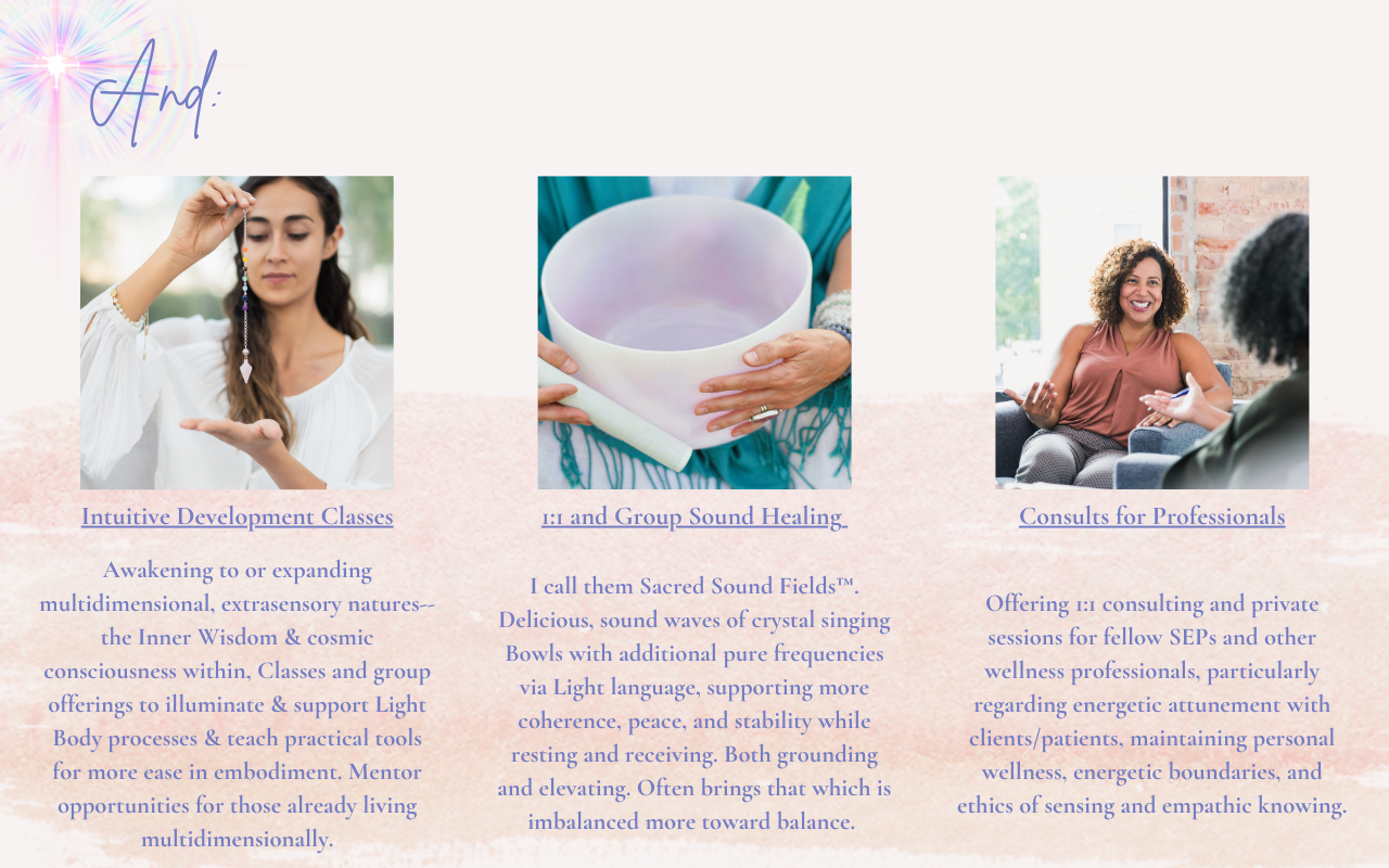 We work together to bring your holistic being into coherence in order to have more ease and to connect with, trust, and express from the infinite wisdom within. It is an honor to support you to have a felt sense of less pain, overwhelm, anxiety, and confusion, and to have tools and ways of connection with your nervous system and your nonphysical nature for more ease, wellness, peace, joy, resilience, and intuitive inner knowing.